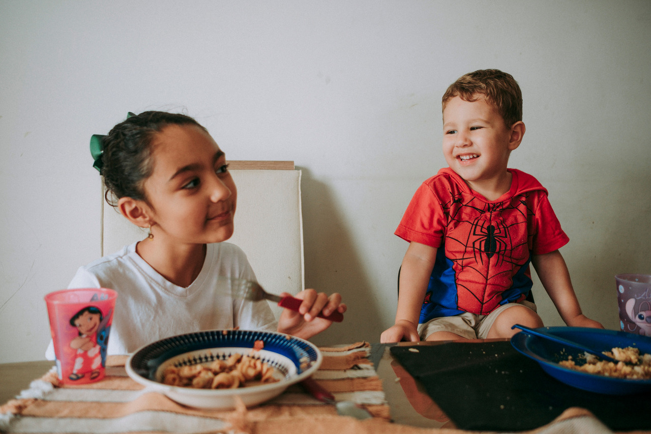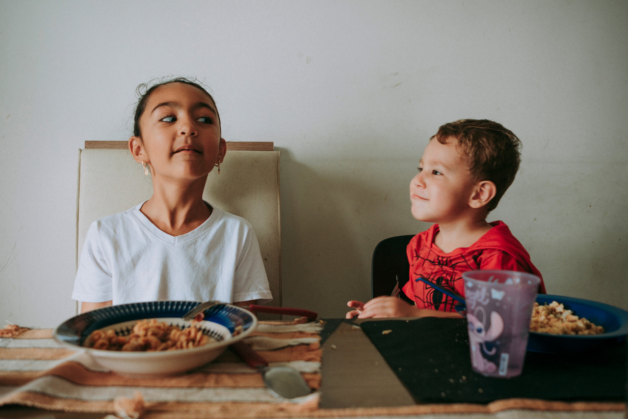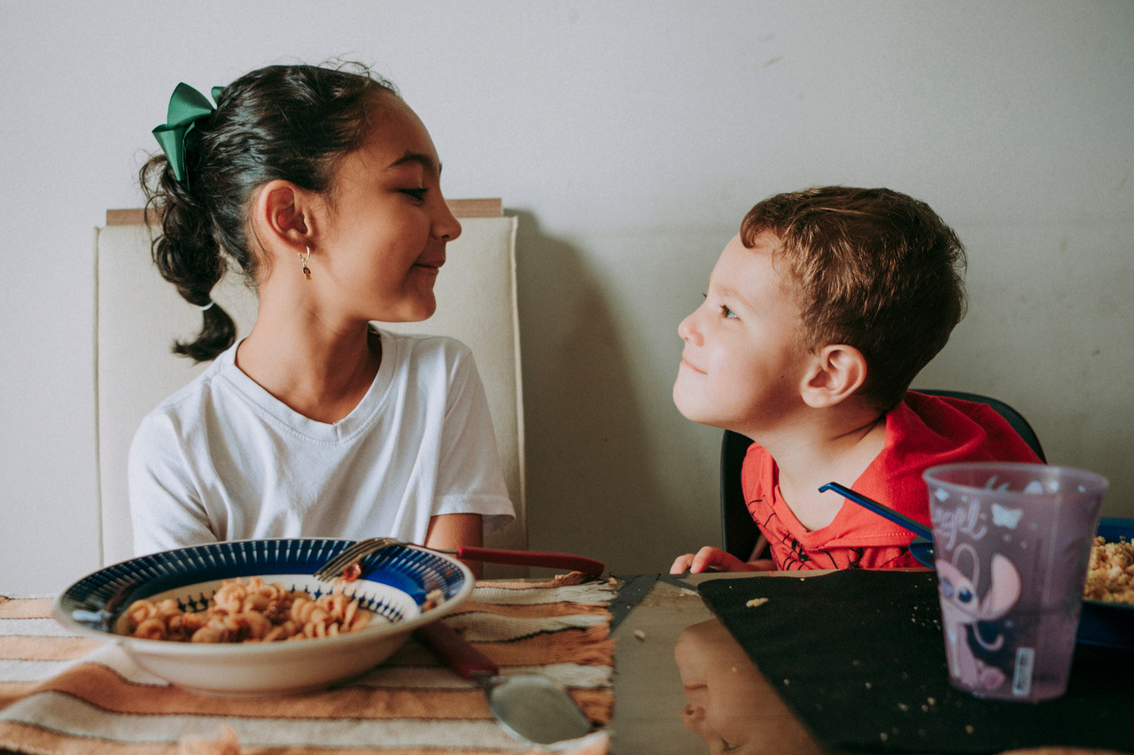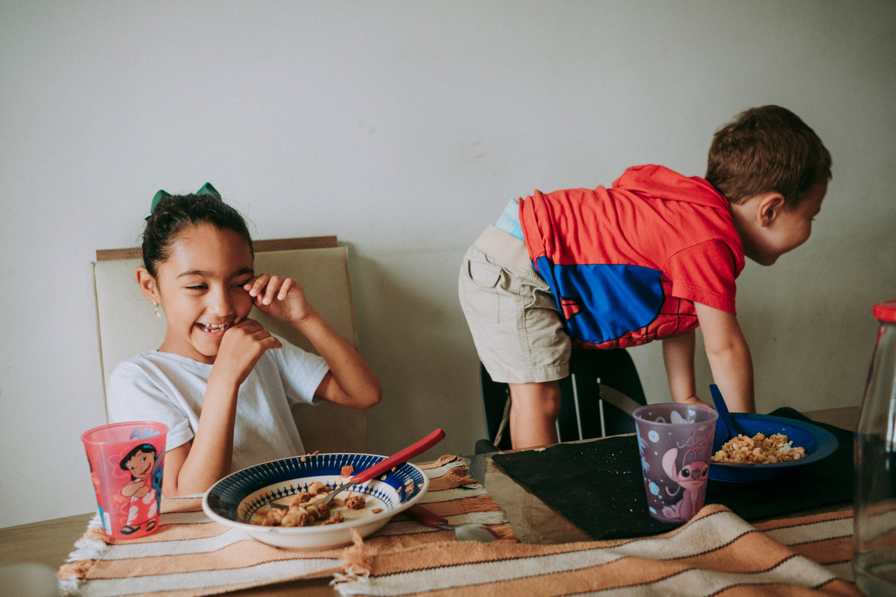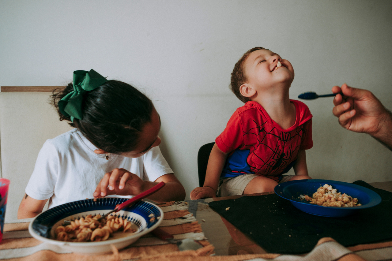 Tem a distração no meio da refeição, a brincadeira que vira gargalhada, a implicância leve que faz parte do afeto. Tem conversa atravessada, tem silêncio também.