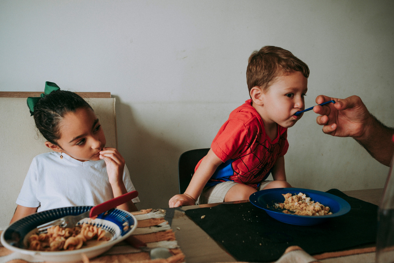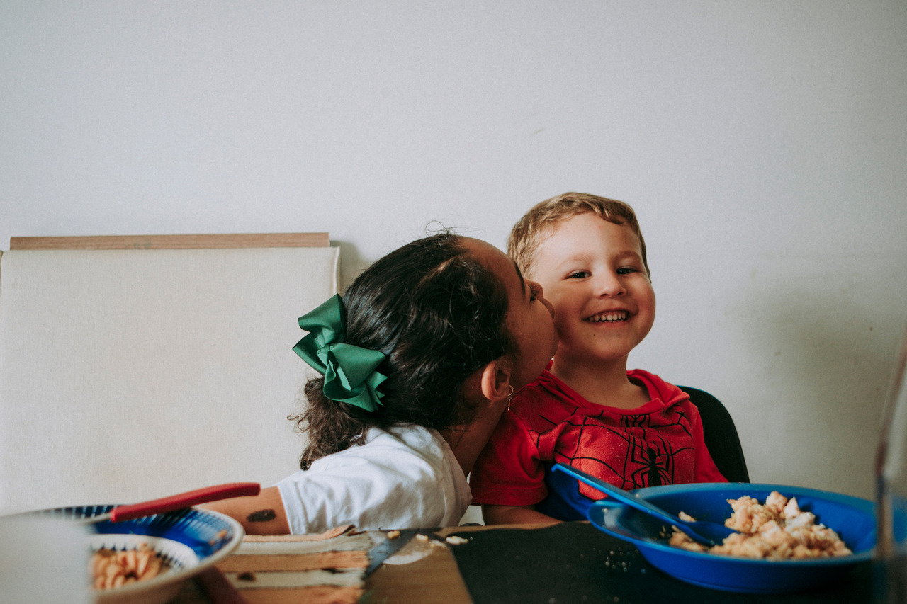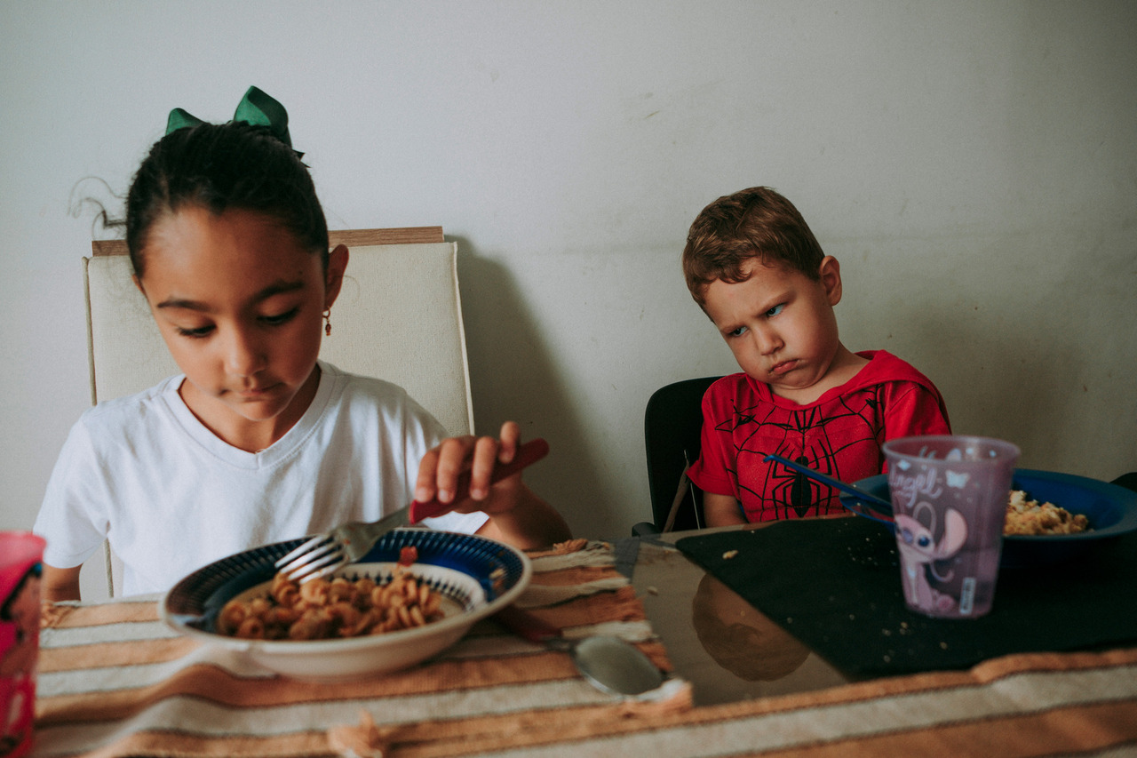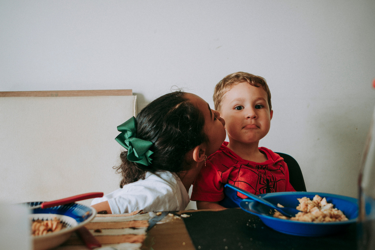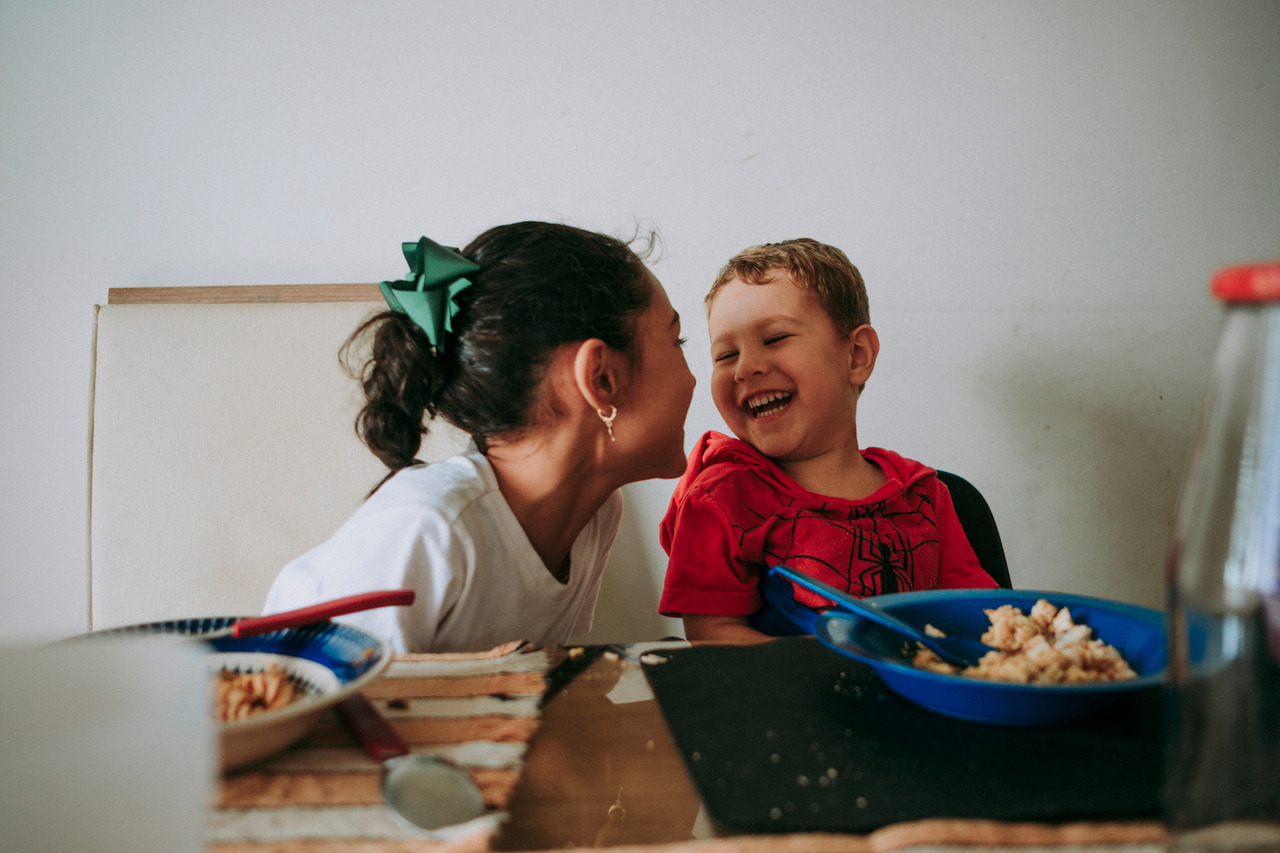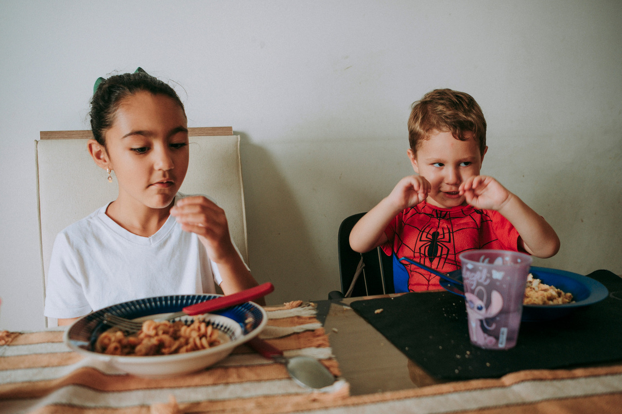 Tem a distração no meio da refeição, a brincadeira que vira gargalhada, a implicância leve que faz parte do afeto. Tem conversa atravessada, tem silêncio também.